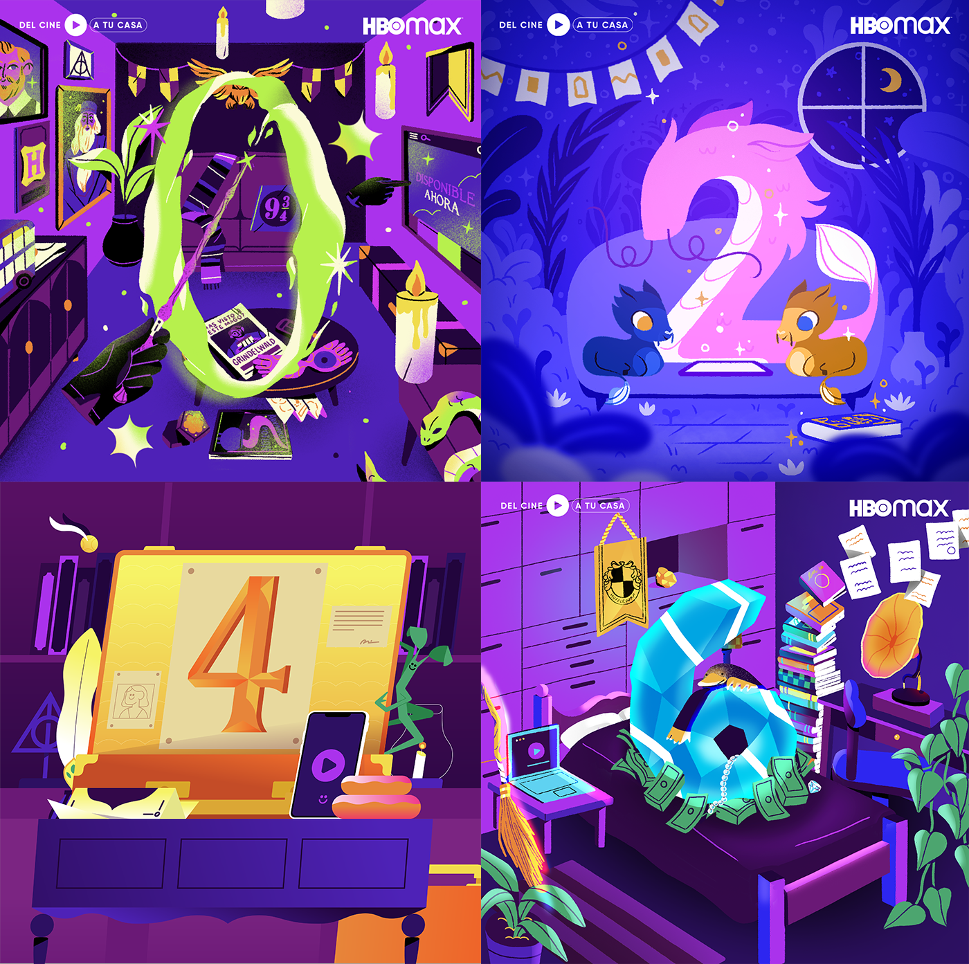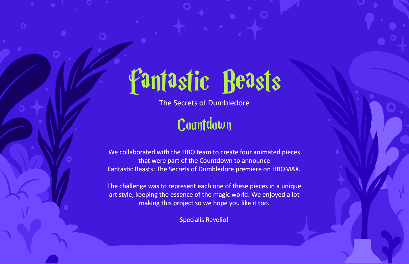 We collaborated with the HBO team to create four animated pieces that were part of the Countdown to announce Fantastic Beasts: The Secrets of Dumbledore premiere on HBOMAX. The challenge was to represent each one of these pieces in a unique art style, ke…