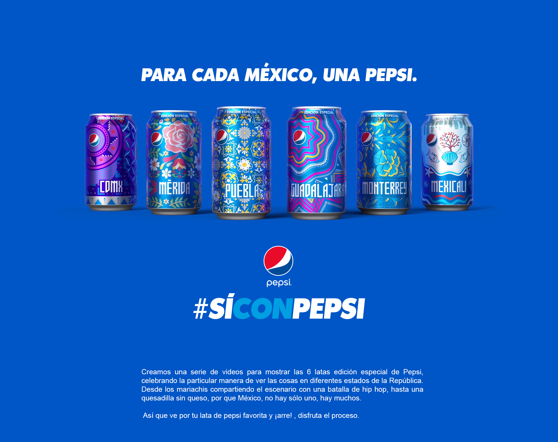 Creamos una serie de videos para mostrar las 6 latas edición especial de Pepsi, celebrando la particular manera de ver las cosas en diferentes estados de la República. Desde los mariachis compartiendo el escenario con una batalla de hip hop, hasta una quesadilla sin queso, por que México, no hay sólo uno, hay muchos.